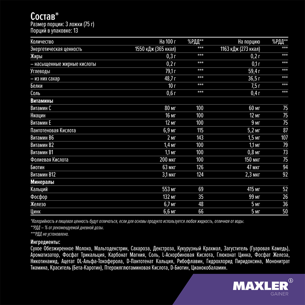 Как принимать: смешайте 3 мерные ложки (75 г) порошка Mega Gainer с 500 мл молока или воды. Употребляйте 2-3 порции в день. Подходит для приема как до, так и после тренировки. Принимайте между приемами пищи в дни, когда вы не тренируетесь, или если ваша цель — просто увеличить количество калорий.