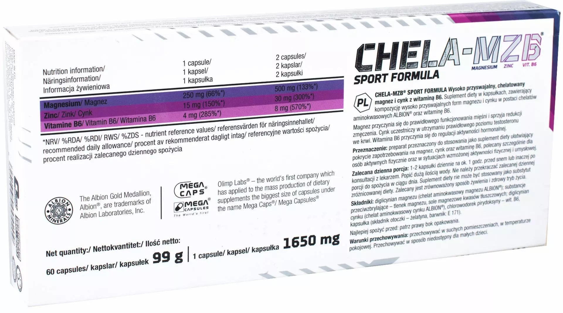 Olimp Sport Nutrition® Хела МЦБ Chela-MZB Sport Formula 60 капс. — высококачественная пищевая добавка, содержащая хелатные формы магния, цинка и витамина B6. Эти нутриенты играют важную роль в поддержке мышечной функции, выработке тестостерона, улучшении восстановления и укреплении нервной системы.